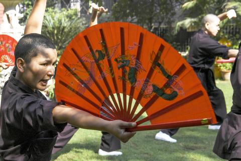 They wielded tasseled swords and open, Chinese-style fighting fans — which are used for signaling commands during combat — emblazoned with dragons and phoenixes.