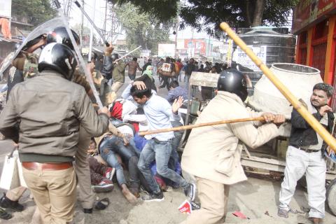 Fresh clashes erupted in Lucknow yesterday when police halted a few hundred people on their way to a planned protest, with security forces firing tear gas and charging with batons, a reporter said.