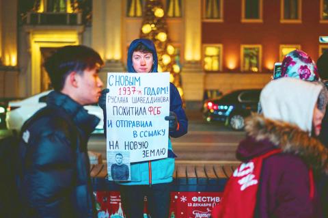 “Ruslan Shaveddinov has been kidnapped by the FSB [Russian Federal Security Service] and exiled to Novaya Zemlya,” the sign said, according to photographs released by Navalny’s allies.