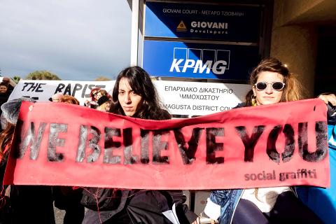 Outside the courtroom a group of about 150 people demonstrated, including about 50 Israelis — mainly women, but some men — who traveled to Cyprus to offer moral support to the woman, shouting “blaming the victim is the second rape” and “Cyprus justice shame on you.”