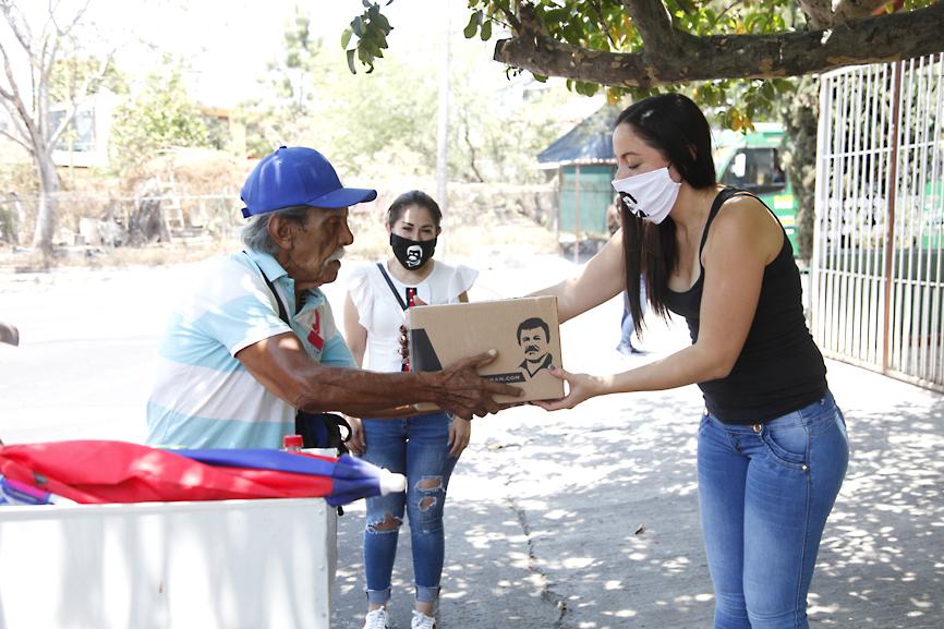 “We are working and contributing. A great pleasure to visit your homes and give you these Chapo handouts,” said a post on Facebook showing Alejandrina Guzman, wearing a black mask bearing El Chapo’s image, handing out parcels.