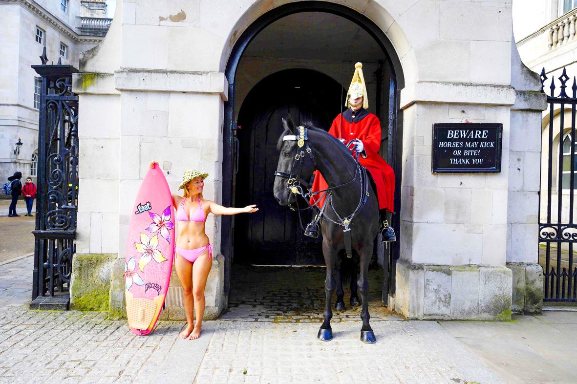 The images also show her night surfing and posing at London landmarks such as Buckingham Palace or following in The Beatles’ footsteps on Abbey Road.