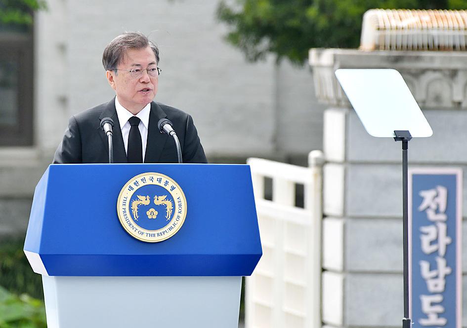 South Korean President Moon Jae-in yesterday honored victims of the pro-democracy Gwangju Uprising, speaking at the spot where protesters were killed 40 years ago.