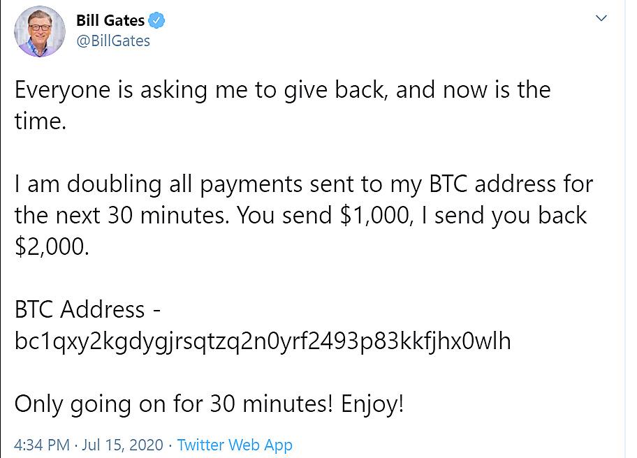 Fraudulent posts, which were largely deleted, said that people had 30 minutes to send US$1,000 in bitcoin, promising they would receive twice as much in return.