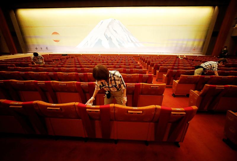 Japan’s stately traditional kabuki theater yesterday resumed performances after a five-month break due to COVID-19, with musicians in masks, actors farther apart on stage and only half the usual number of seats.