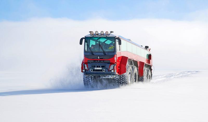 The red vehicle is 15m long and fitted with massive tires for traction across the powder snow of western Iceland’s vast Langjokull ice cap.