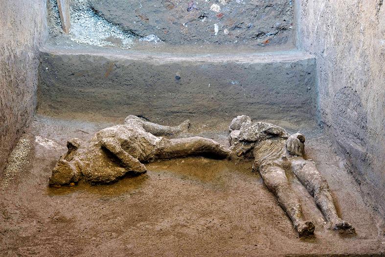 The remains of the two victims, lying next to each other on their backs, were found in a layer of gray ash at least 2m deep, they said.