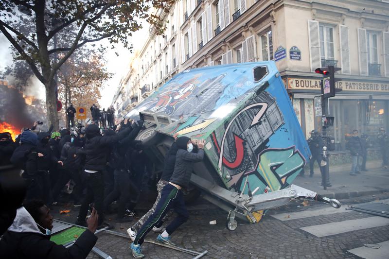Several fires were started in Paris, sending acrid smoke into the air, as protesters vented their anger against the security law, which would restrict the publication of police officers’ faces.