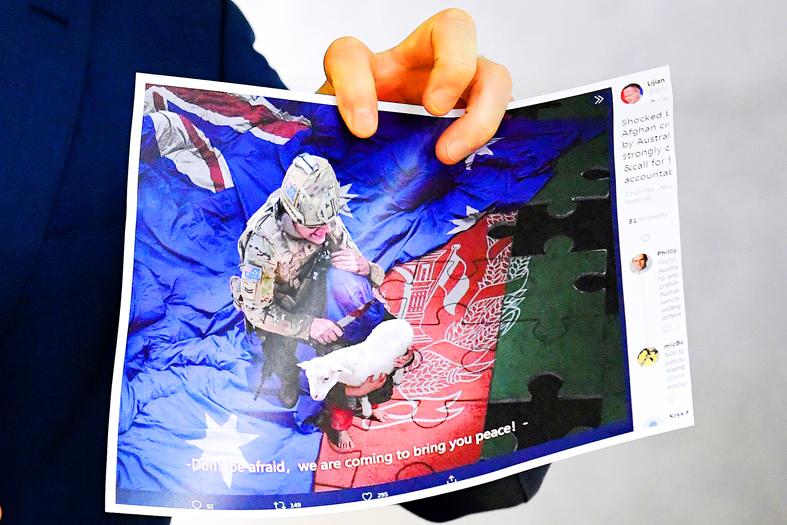 Chinese Ministry of Foreign Affairs spokesman Zhao Lijian (趙立堅) sparked outrage in Canberra on Monday when he posted a staged image of a man dressed as an Australian soldier holding a bloody knife to the throat of an Afghan child holding a sheep, with other body shapes hidden below a large Australian flag.