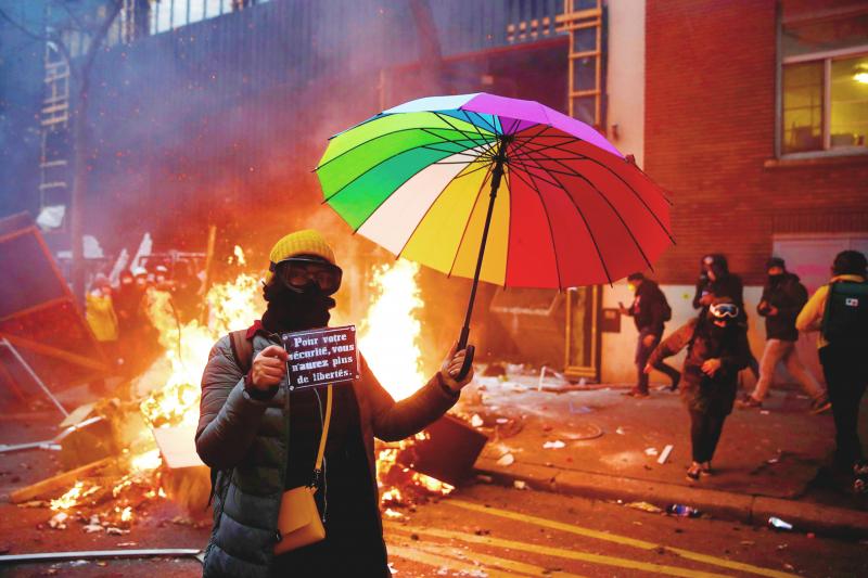 Thousands of people across France protested a proposed bill that could make it more difficult for witnesses to film police officers, with tensions quickly rising at the Paris march on Saturday as intruders set fire to several vehicles, pillaged a bank and tossed objects at police.
