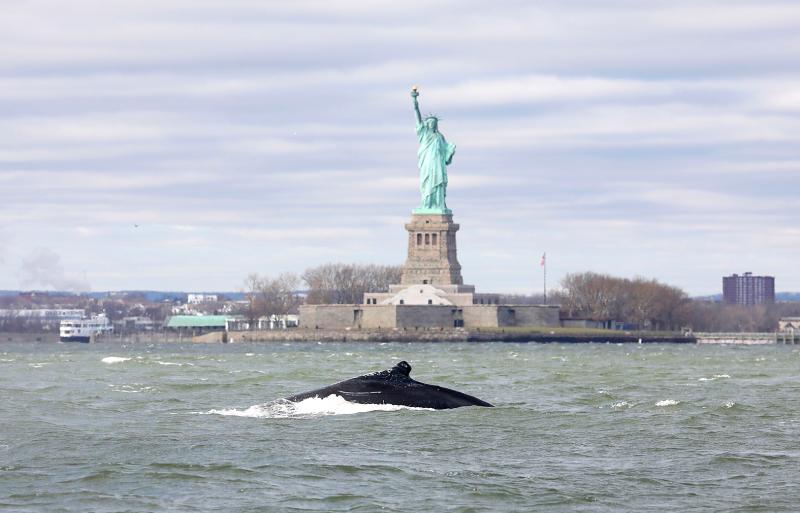 A humpback whale ready for its closeup on Tuesday frolicked in front of the Statue of Liberty, One World Trade Center and other iconic sights off New York Harbor.