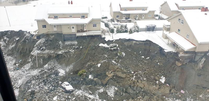 Homes were buried under mud, others cut in two and some houses left teetering over a crater caused by the mudslide, with several falling over the edge.