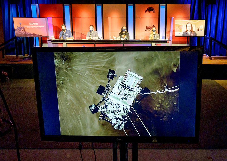 NASA scientists on Friday presented striking early images from the picture-perfect landing of the Mars rover Perseverance, including a selfie of the six-wheeled vehicle dangling just above the surface of the Red Planet moments before touchdown.