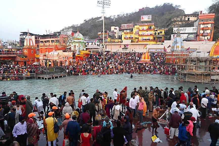 Naked, dreadlocked holy men yesterday were among hundreds of thousands of jubilant Hindu pilgrims who thronged the banks of India’s Ganges River, ignoring any COVID-19 threat, for one of the nation’s most famous and colorful religious festivals.