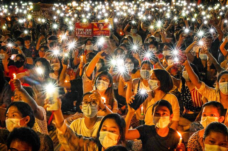 Saturday’s killings did not faze demonstrators in Naypyidaw, where they crowded a downtown commercial area past the official 8pm curfew to hold a mass candlelight vigil and sing about their cause. The mostly young protesters rallied at an intersection where they usually gather for daytime protests.
