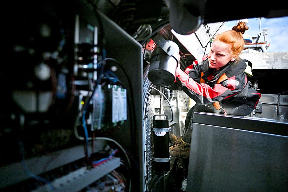 Sitting alongside him were three computer technicians checking the equipment remotely. Meirwen Jenking-Rees, a 21-year-old student engineer, checked the ship’s engines before it headed out for a sea trial.