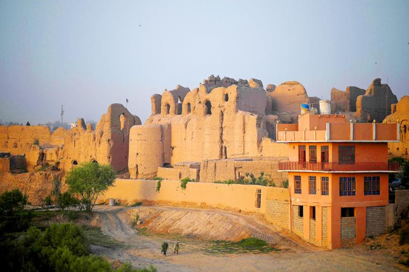 The astonishing ocher clay complex juts from the cliffs along the Helmand River, threatened by decay and encroaching urban sprawl, as well as the makeshift constructions that have grown within it.