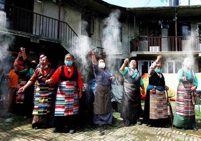 This year, due to the COVID-19 pandemic, the celebrations were muted and behind closed doors. However, a banner marking his birthday hung in the town square, and Tibetan monks distributed sweets and juice to passersby outside the closed temple.