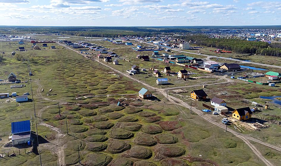 The bumpy landscape around Churapcha, about 5,000km east of Moscow, resembles giant sheets of bubble wrap in places where ice wedges inside the ground have melted, causing the ground to crumble, sag or cave in altogether.