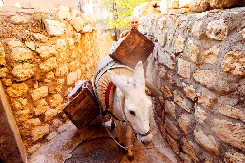 Guided by city workers, the animals carry waste bags, winding through the narrow alleys of the city, built on a cliff overlooking what was once Mesopotamia, 60km from Syria.