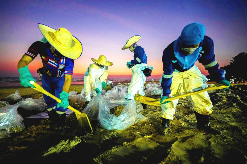 About 200 Royal Thai Navy personnel and 150 people from Star Petroleum were helping in the cleanup with equipment to absorb and skim the oil, while two backhoes dug a trench to capture the incoming oil.