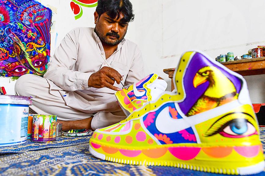 Haider Ali dabs a brush with an iridescent glob of paint and gets to work on a pair of sparkling white trainers — his latest canvas for a carnival of color celebrating Pakistani culture.