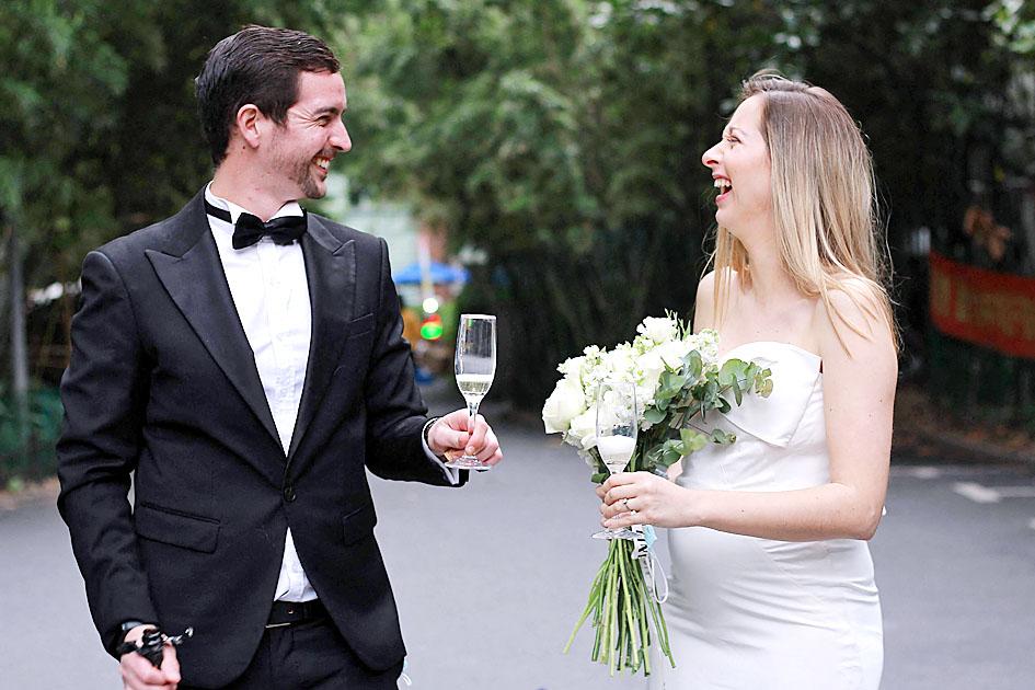 After a month stuck at home, the couple had their wedding officiated online by a US celebrant, with friends and family as witnesses, before they headed to the parking lot for a small celebration.