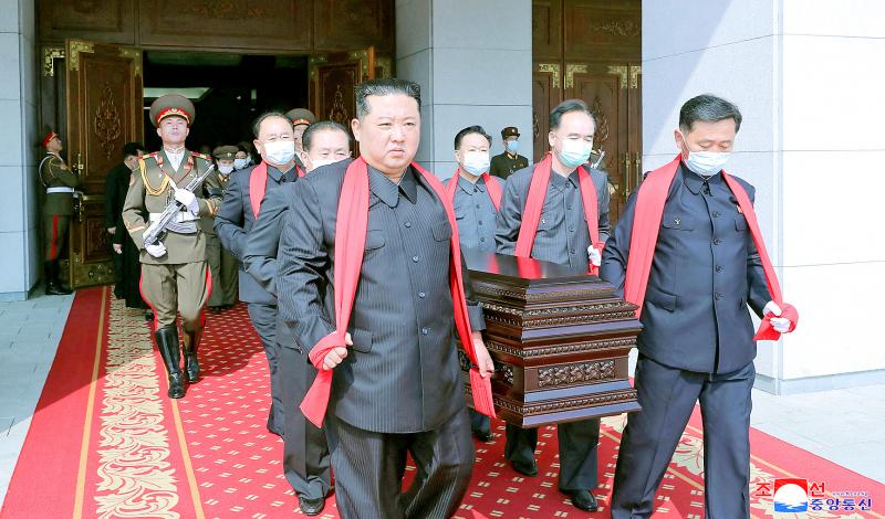 In what was one of the country’s biggest state funerals since his father’s death, a bare-faced Kim Jong-un carried Hyon’s coffin with other top officials who wore masks before he threw earth to his grave with his hands at the national cemetery.