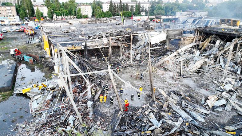 Firefighters and soldiers yesterday searched for survivors in the rubble of a shopping mall in central Ukraine after a Russian missile strike killed at least 18 people in an attack condemned by the UN and the West.