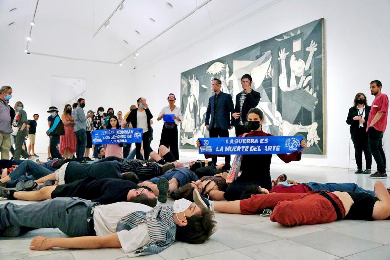 In pictures and a video posted on social media, a dozen protesters could be seen lying on the floor, corpse-like, in front of Picasso’s masterpiece, inspired by the bloody air raid on the town of Guernica during the Spanish Civil War.