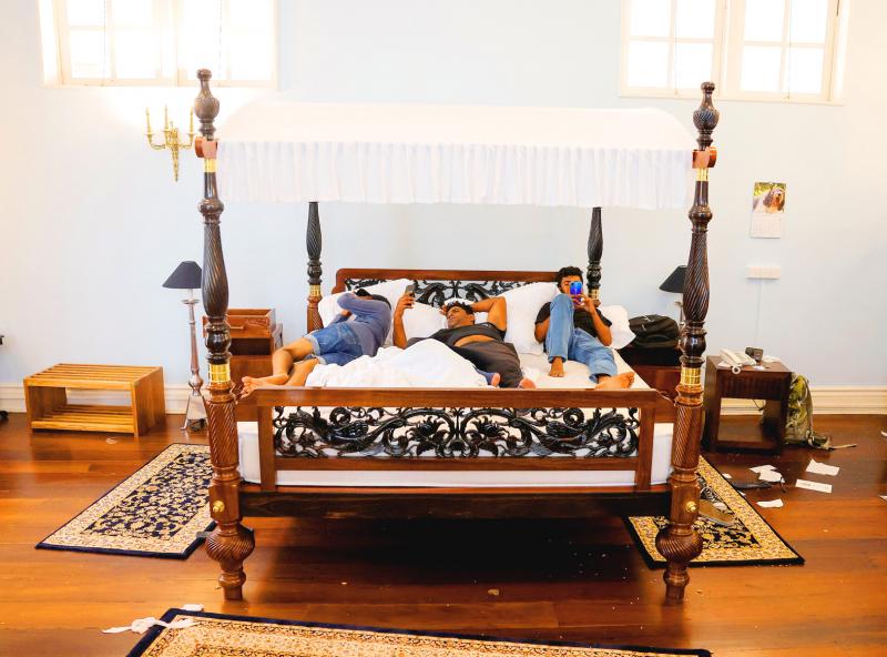Protesters, many wrapped in Sri Lanka’s national flag, swarmed into his whitewashed colonial-era residence on Saturday, jumped into the swimming pool and sat on a four-poster bed.