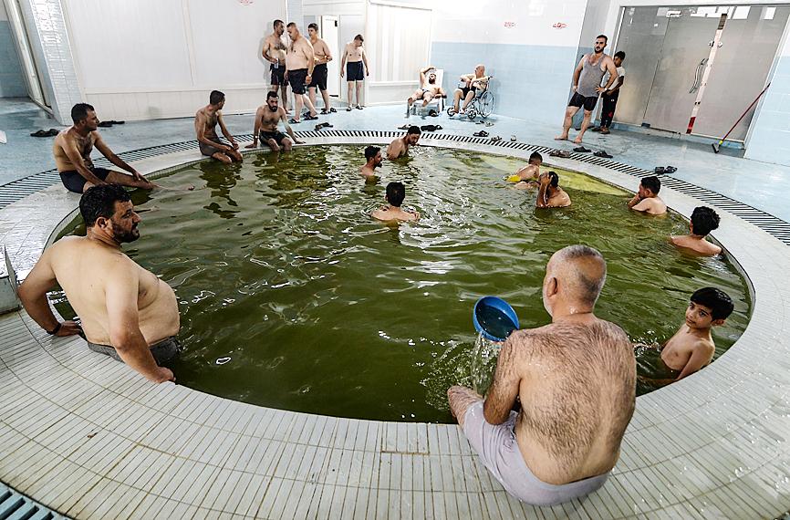 In its newly tiled rooms, men and children enjoy a moment of therapeutic relaxation for 5,000 dinars (US$3.43). In underpants or shorts they fill tubs with green, hot-spring water, pouring it over their heads and then vigorously rubbing their bodies, despite the nauseating smell characteristic of sulfur.