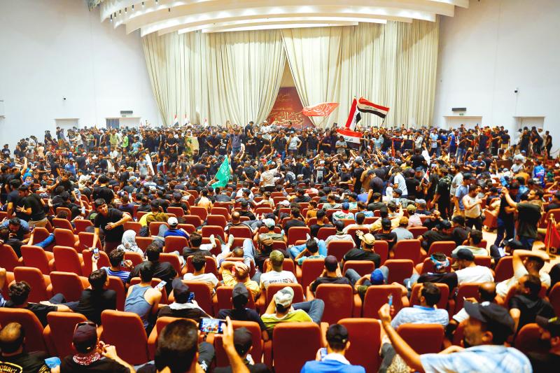 The crowds entered the chamber after thousands of protesters had massed at the end of a bridge leading to the heavily fortified Green Zone before dozens pulled down concrete barriers and ran inside, an Agence France-Presse photographer reported.