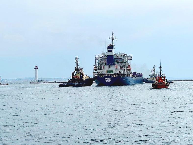 The first ship carrying Ukrainian grain yesterday set off from the port of Odesa under a deal brokered by the UN and Turkey that is expected to release large stores of Ukrainian crops to foreign markets and ease a growing hunger crisis.