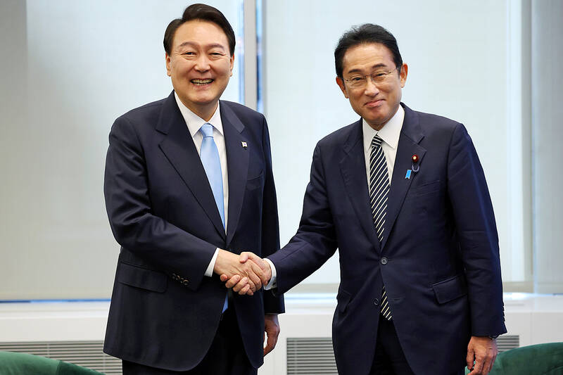 During their 30-minute meeting on Wednesday in New York, South Korean President Yoon Suk-yeol and Japanese Prime Minister Fumio Kishida shared the need to improve bilateral ties and agreed to instruct their respective diplomats to step up talks for that, Yoon’s office said in a statement.