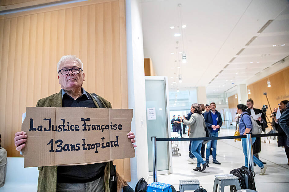 Another man came to the trial with a sign reading: “French Justice. 13 Years Too Late.”