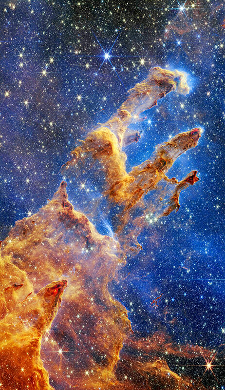 The twinkling of thousands of stars illuminates the telescope’s first shot of the gigantic gold, copper and brown columns standing in the midst of the cosmos.