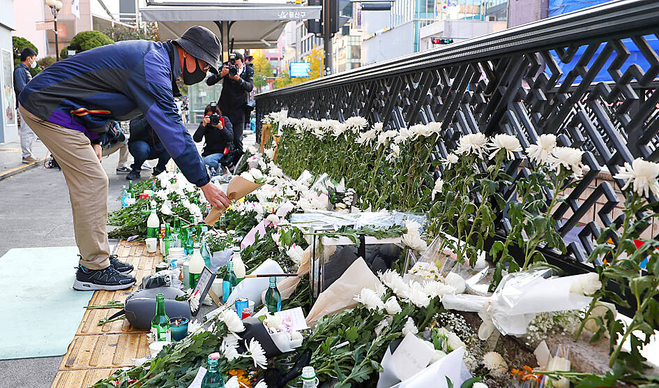 Many people also laid chrysanthemums, bottles of soju, candles and snacks near an Itaewon subway station, with a host of condolence messages posted on the wall and elsewhere.