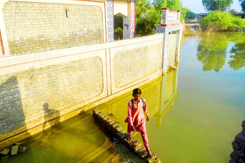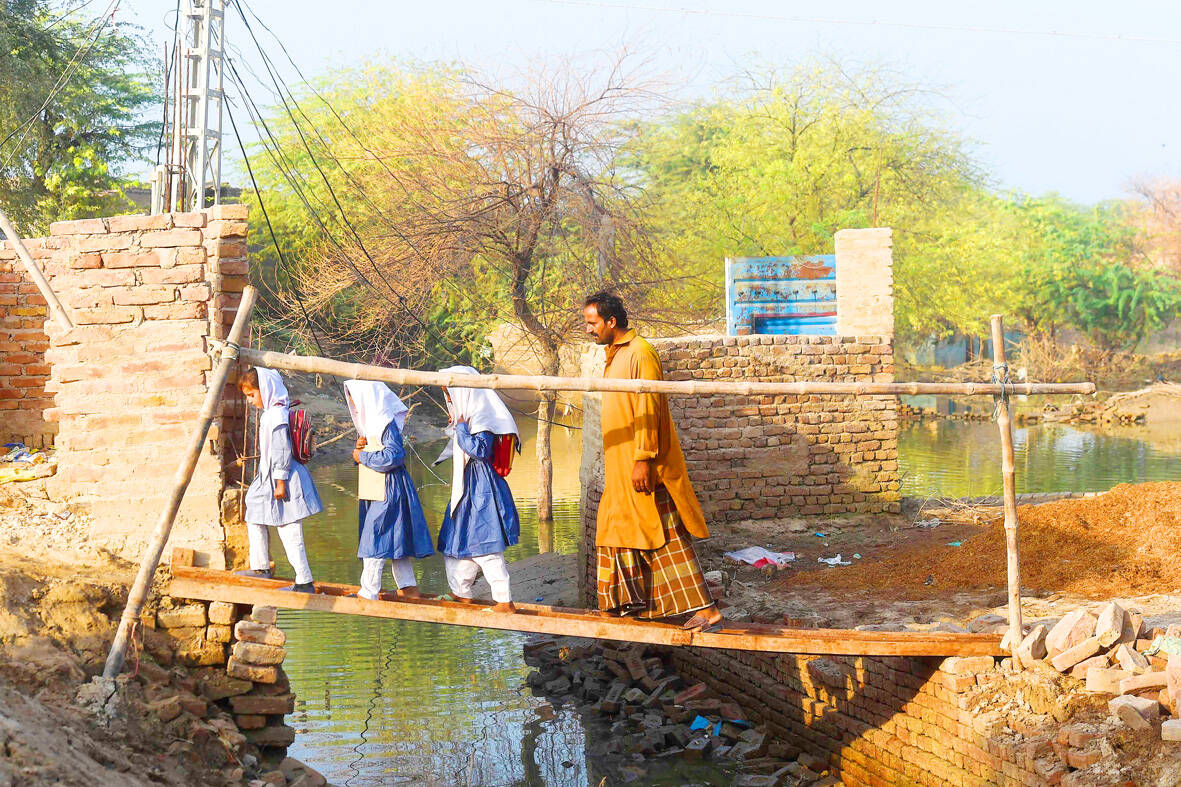 Pakistani three-year-old Afshan’s trip to school is a high-wire balancing act, as she teeters across a metal girder spanning a trench of putrid floodwater, eyes fixed ahead.