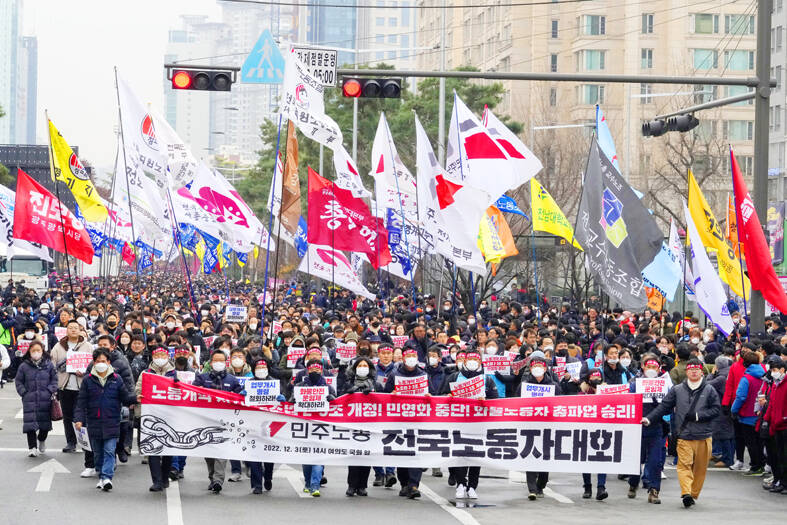 Thousands of demonstrators representing organized labor yesterday marched in South Korea’s capital denouncing government attempts to force thousands of striking truckers back to work after they walked out in a dispute over the price of freight.
