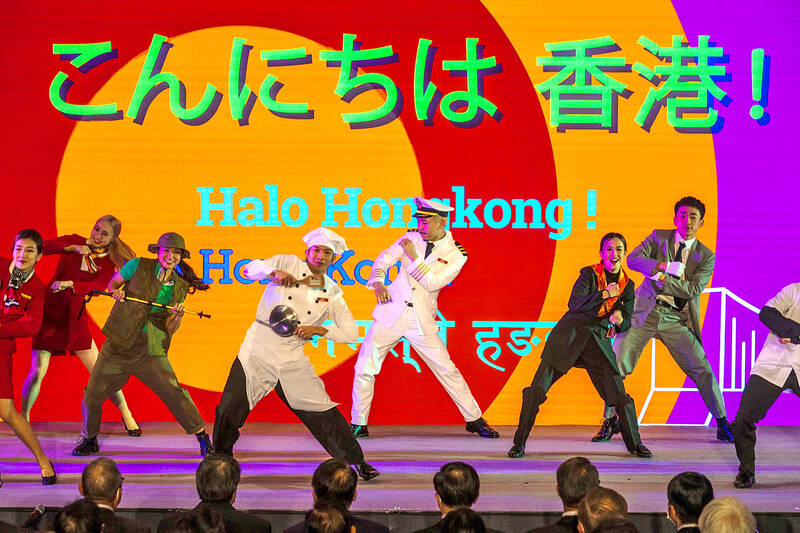 The “Hello Hong Kong” campaign was launched with dancers and flashing neon lights in the territory’s main convention center, next to its famous harbor, with a backdrop bearing the slogan in various languages including Russian and Spanish.