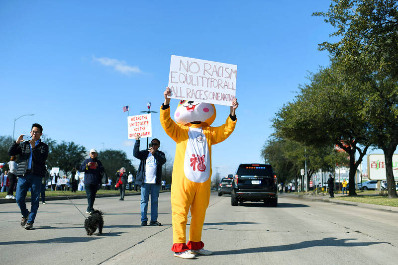 About 300 protesters marched through Houston’s Chinatown, shouting “Stop Chinese hate” and “Texas is our home.”