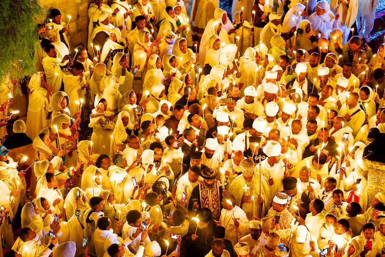 Clutching candles, so the flame can be passed from one to another, pilgrims attended the church this year in reduced numbers.