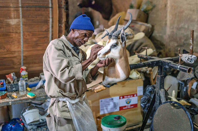 Workers in Pieter Swart’s tanning and taxidermy workshop are busy skinning impala heads, bleaching buffalo bones and softening zebra skins.