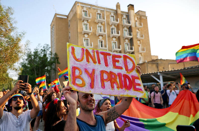 Chanting “peace” and “united by pride across the green line” — a reference to the dividing line — there were cheers when activists draped a building with the colors of the rainbow.