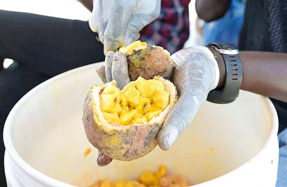 Picking the fruit is done by hand and involves using long sticks — a task that involves the added risk of snakes.