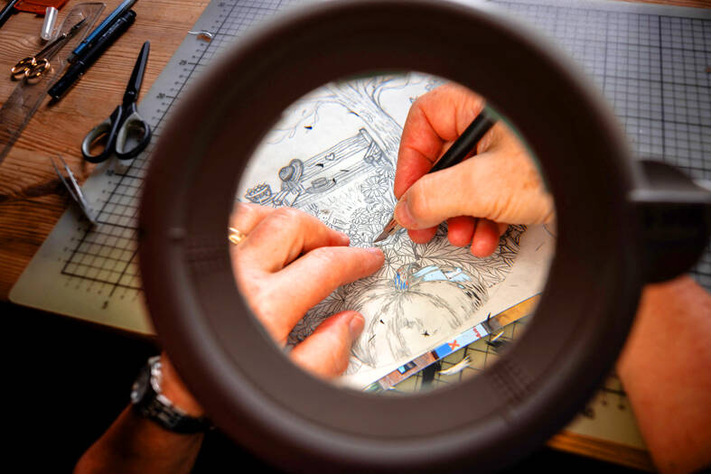 Marianne Dubuis stared intently through a magnifying glass, using a slim cutter to make tiny incisions in paper as she carved out delicate tableaux of life and human emotions.
