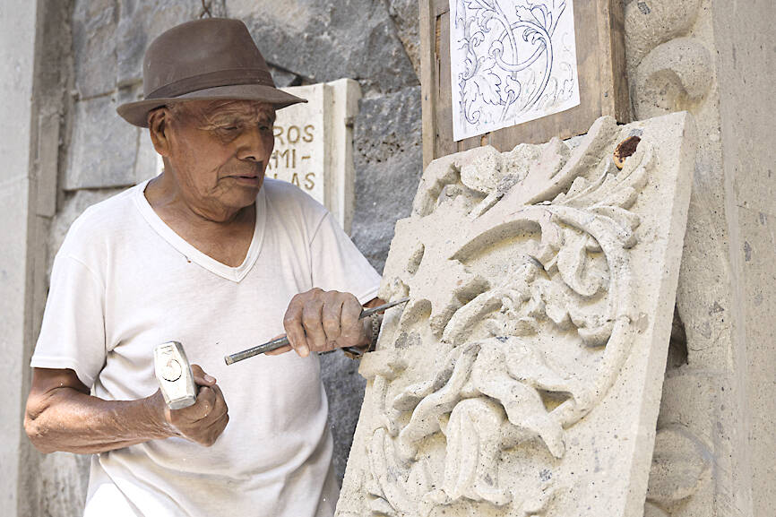 Juan Alfaro Bastidas, 75, is a carver, just as his father and grandfather were. He recalls going into the quarries by candlelight to get blocks of stone.