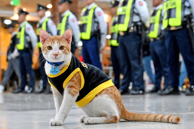A cat wearing a black and yellow security vest strolls nonchalantly past security guards lined outside a Philippine office building waiting to receive instructions for their shift.