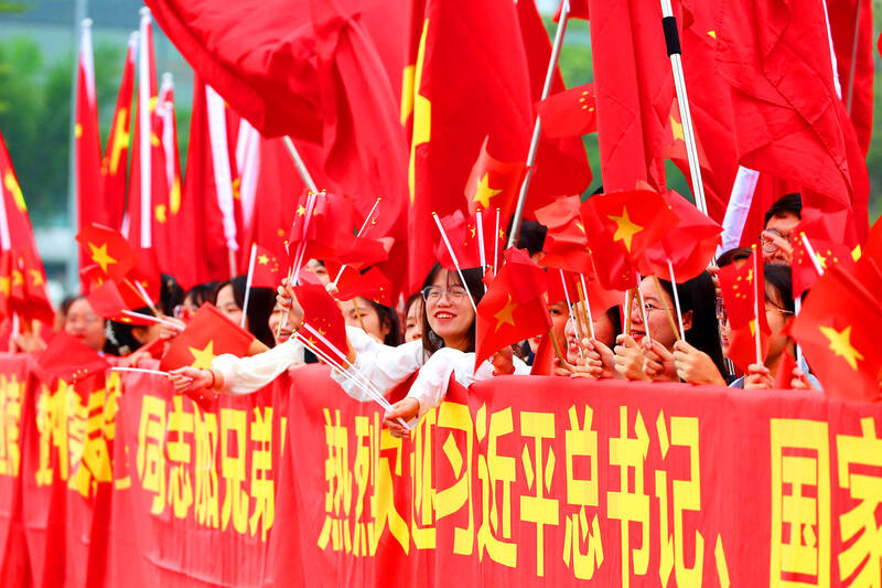 The Chinese leader received a red carpet welcome as Chinh greeted him on the tarmac. Dozens of Chinese and Vietnamese nationals gathered at the airport, waving Chinese and Vietnamese flags to welcome Xi and his wife, Peng Liyuan (彭麗媛), who accompanied him on the visit.